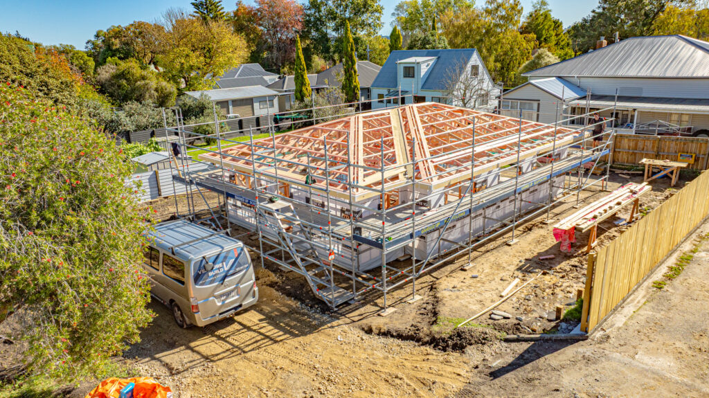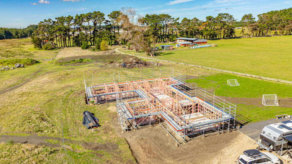 Framing is up, scaffolding is in place, and the trusses are next. This 240sqm architectural build at Kaitoke is starting to show exactly what it’s going to be – bedroom wings that separate from the living areas, a kitchen scullery, and a double garage, all sitting in one of the most picturesque settings around. This is the build to watch!
